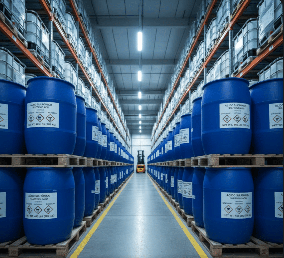 El Ácido Sulfónico es corrosivo en su estado puro. Exigimos el cumplimiento total de los protocolos de seguridad y el uso de Equipos de Protección Personal (EPP) adecuados durante su trasvase y manipulación.