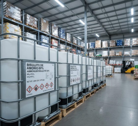 El Bisulfito de Amonio 60% es un producto corrosivo (Clase 8 ADR/IMO). Debe manipularse con equipo de protección personal completo y almacenarse en áreas bien ventiladas, en contenedores compatibles (polietileno de alta densidad o acero inoxidable) y lejos de ácidos, bases y agentes oxidantes.