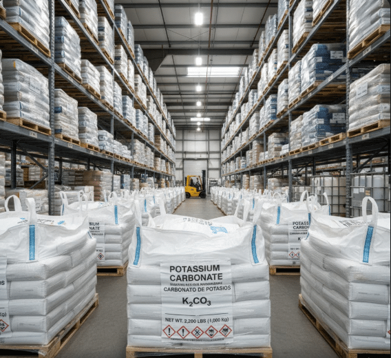 El Carbonato de Potasio es higroscópico. Debe almacenarse en un lugar fresco y seco, sellado herméticamente, para evitar la aglomeración y garantizar su eficacia.