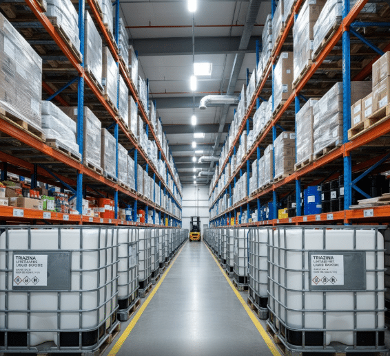 La Triazina (comúnmente Hexahidro-1,3,5-tris(2-hidroxietil)-s-triazina) es un compuesto orgánico de nitrógeno crucial en la industria pesada. Se presenta como una solución acuosa y es el agente preferido para la eliminación de Sulfuro de Hidrógeno (H2S) en las fases de producción y transporte de petróleo y gas, así como un potente biocida de amplio espectro.